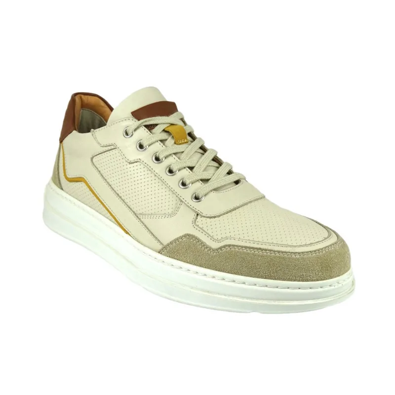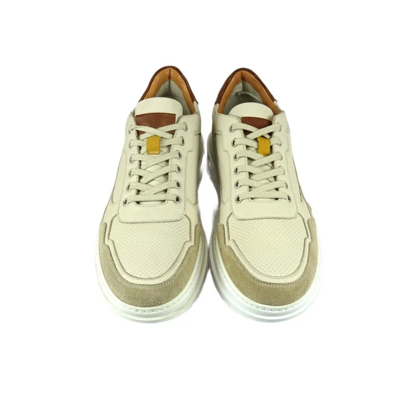 Cholewka została wykonana z wysokiej jakości skóry naturalnej o miękkiej strukturze, co znacząco podnosi komfort noszenia oraz trwałość obuwia. Perforowane panele boczne i przednia część buta poprawiają wentylację stopy, dzięki czemu beżowe trampki skórzane casual świetnie sprawdzają się w cieplejsze dni oraz podczas całodziennego użytkowania.