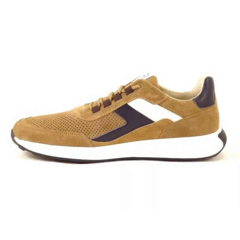 Cholewka została wykonana z wysokiej jakości skóry naturalnej zamszowej, uzupełnionej wstawkami z gładkiej skóry. Perforacje w przedniej części i na bokach poprawiają wentylację, zwiększając komfort użytkowania w cieplejsze dni. Beżowe sneakersy skórzane casual wyróżniają się dopracowanymi detalami, kontrastowymi elementami bocznymi oraz nowoczesnym wykończeniem.