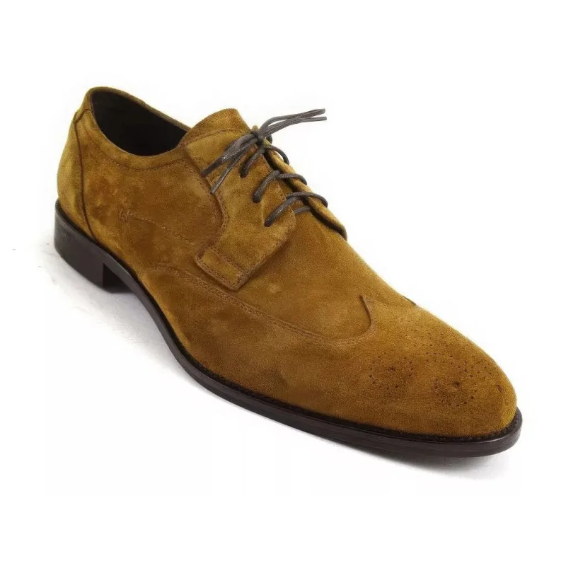 Brązowe brogsy męskie zamszowe Pilpol Prato PC068 to eleganckie derby typu wingtip z pełnym brogowaniem. Model wykonany z naturalnego zamszu w ciepłym, miodowo-brązowym odcieniu. Otwarta przyszwa (derby) oraz 5 par eyeletów zapewniają komfort dopasowania, a klasyczna linia kopyta nadaje sylwetce lekkości.