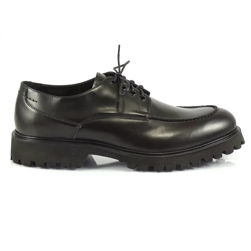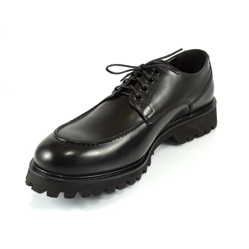 Model osadzony jest na lekkiej, amortyzującej podeszwie o wyraźnym bieżniku typu traktor, który zapewnia stabilność i dobrą przyczepność do podłoża. Buty casual czarne męskie doskonale sprawdzają się w codziennym użytkowaniu – zarówno w mieście, jak i podczas aktywnego dnia. Masywniejsza podeszwa nadaje obuwiu charakteru, zachowując jednocześnie komfort noszenia.