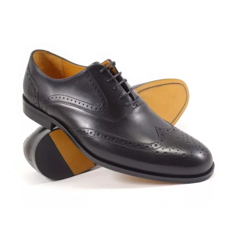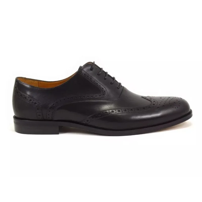 Cholewka została wykonana z wysokogatunkowej skóry naturalnej licowej o eleganckim połysku. Charakterystyczne perforacje typu full brogue obejmują skrzydła (wingtip), linie przeszyć oraz klasyczny medalion na czubku, co nadaje modelowi wyrafinowanego wyglądu. Czarne oxfordy brogsy eleganckie zachowują formalny charakter, a jednocześnie wyróżniają się dekoracyjną, luksusową stylistyką.