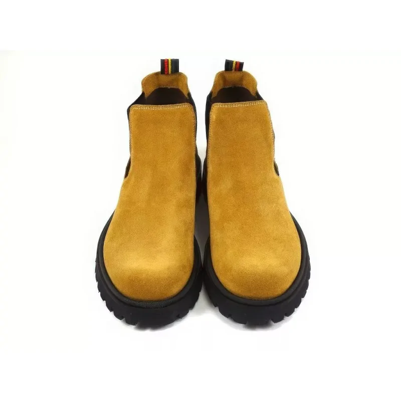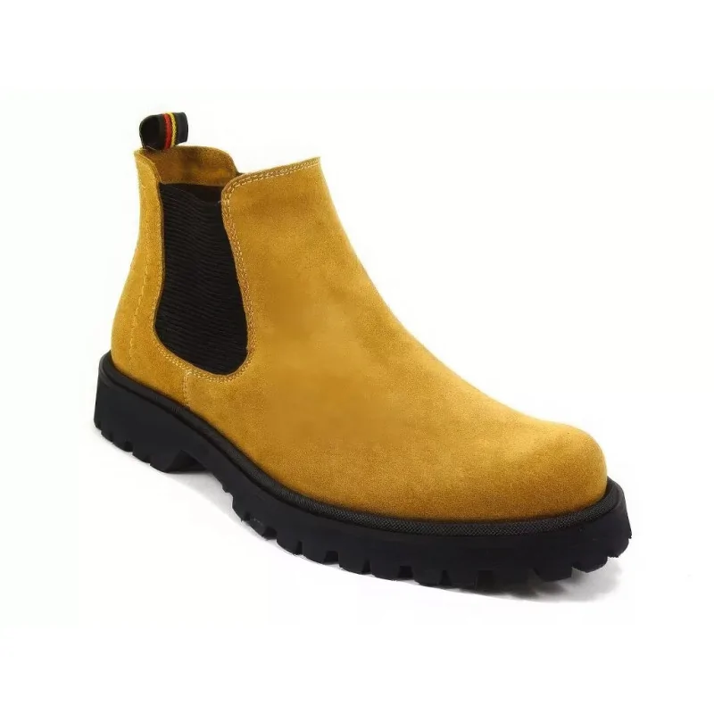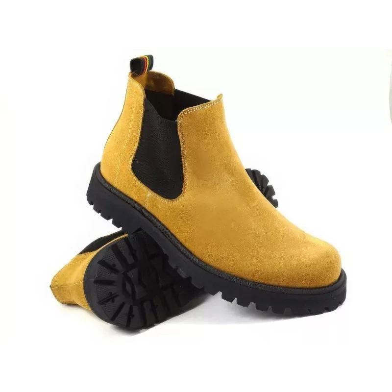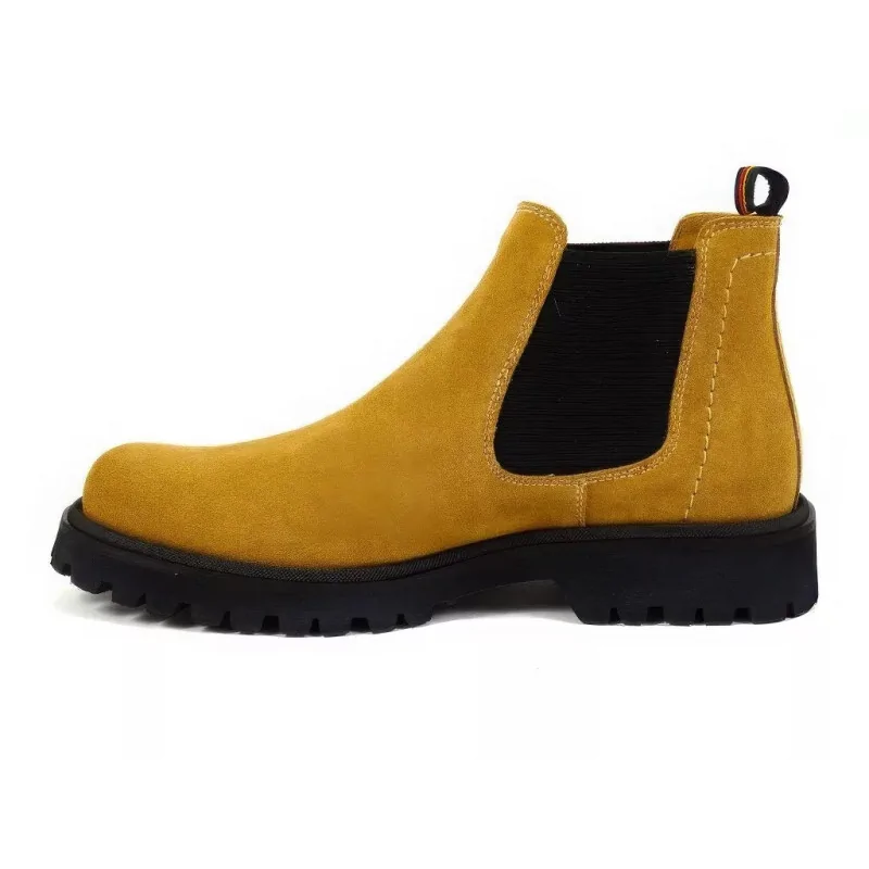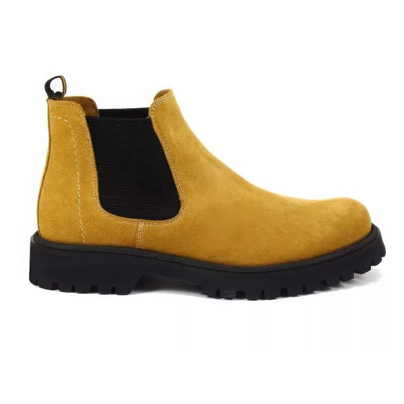 Casualowe sztyblety beżowe zamszowe wykonane z naturalnego zamszu, z ociepleniem oraz lekką, grubą podeszwą typu traktor. Stylowe męskie sztyblety ocieplane z elastycznymi gumami po bokach, idealne na sezon jesienno-zimowy i codzienne stylizacje miejskie.