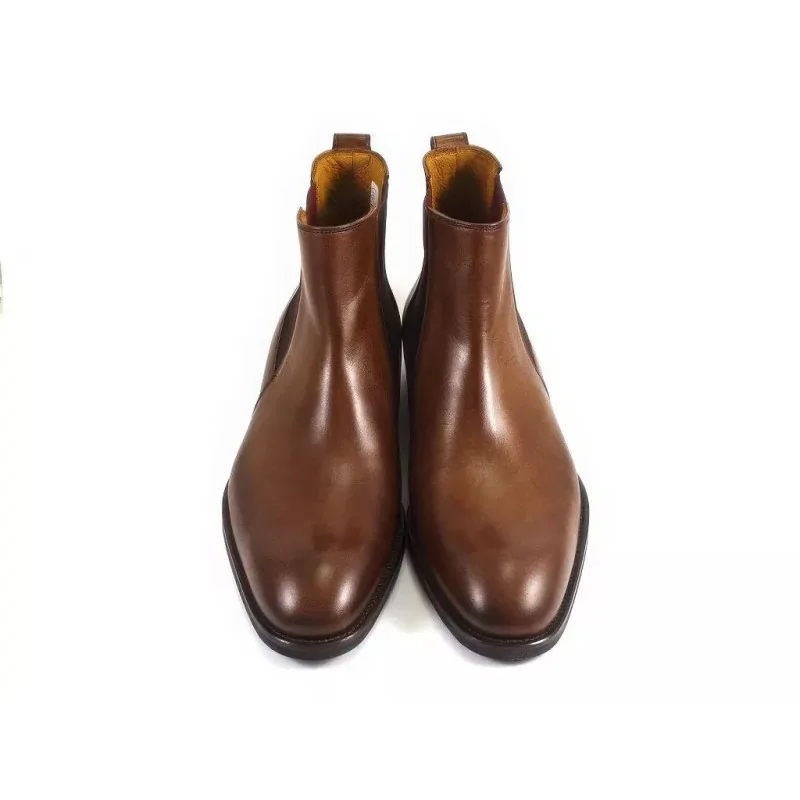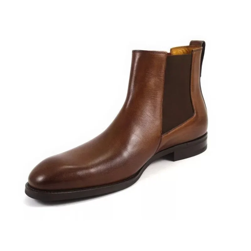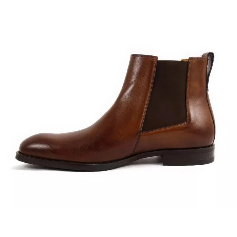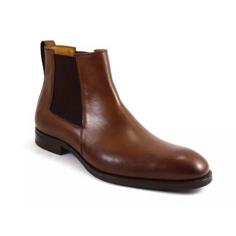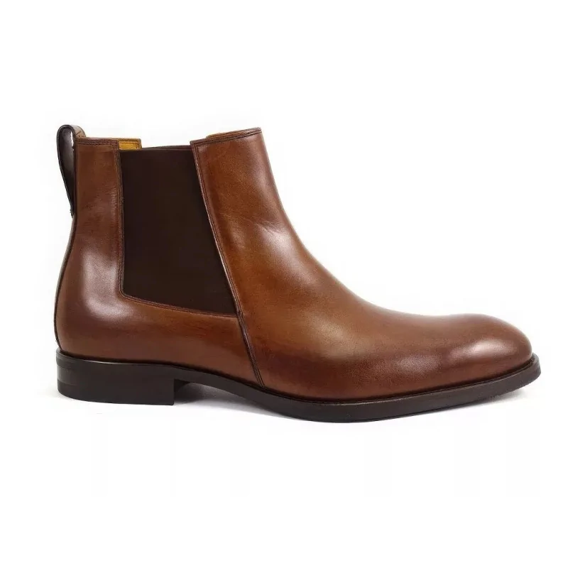 Eleganckie sztyblety orzechowe w segmencie premium, wykonane z wysokiej jakości skóry naturalnej, z elastycznymi gumami po bokach i skórzaną wyściółką. Stylowe męskie sztyblety skórzane o smukłym kopycie, idealne do stylizacji biznesowych, smart casual i eleganckich.