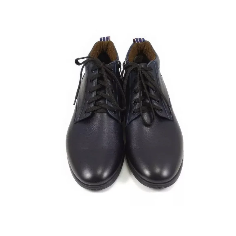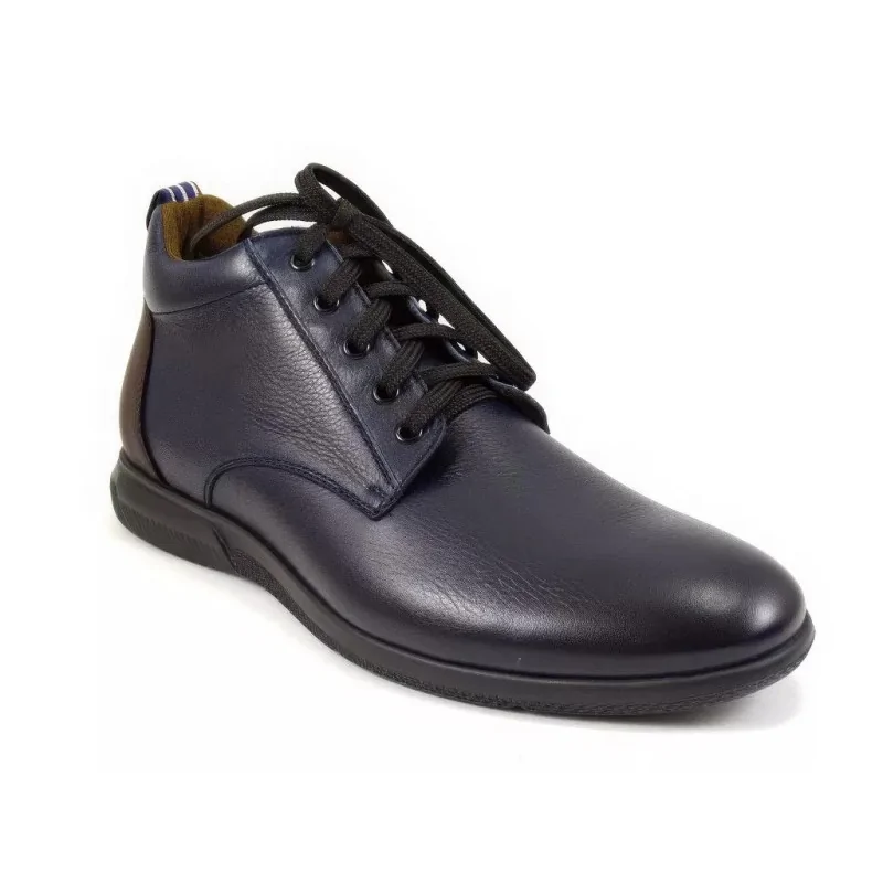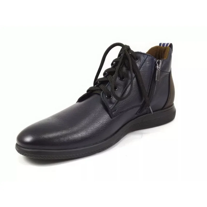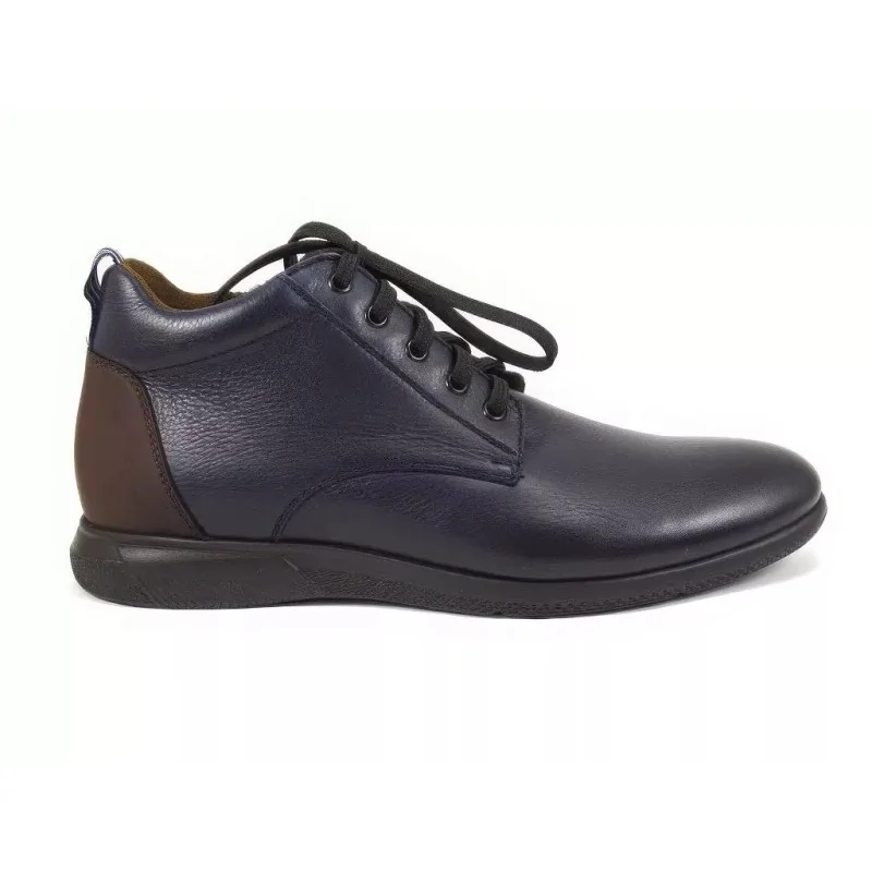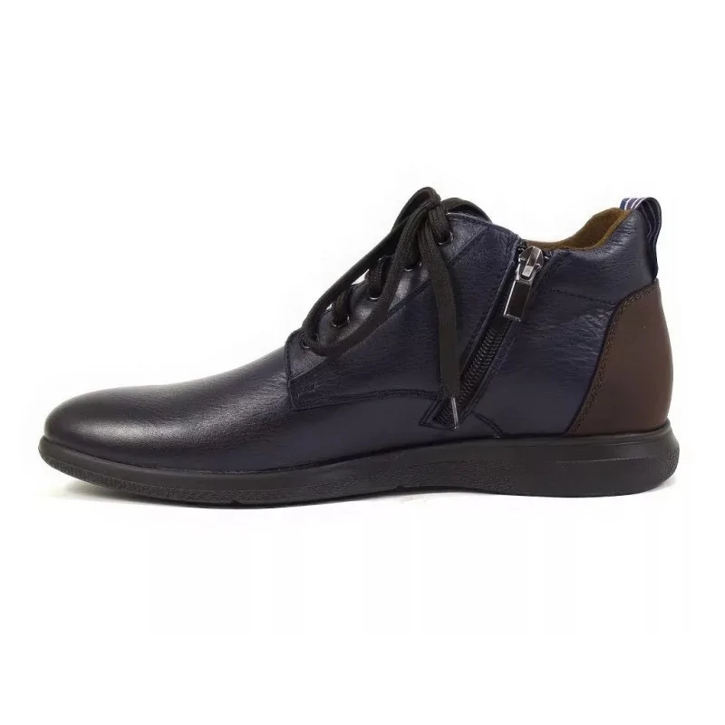 Nowoczesne trzewiki sportowe granatowe w stylu casual, wykonane ze skóry naturalnej w wersji dual color, z suwakiem oraz lekką podeszwą. Komfortowe męskie trzewiki casual z materiałową wyściółką cambrerra, idealne do codziennych stylizacji miejskich.