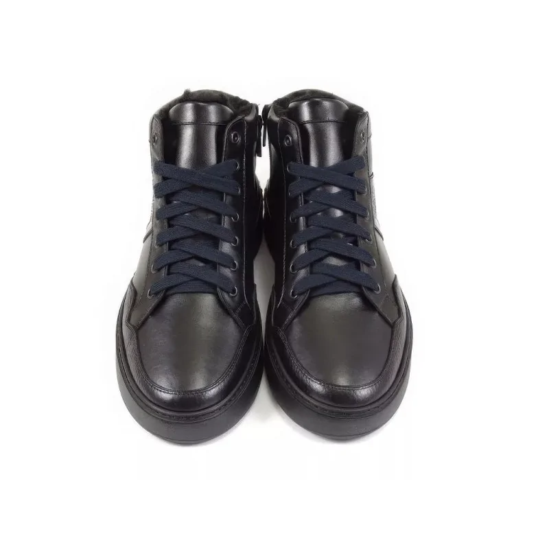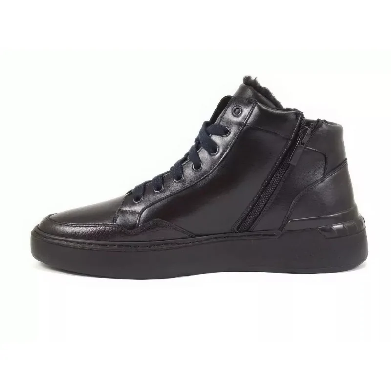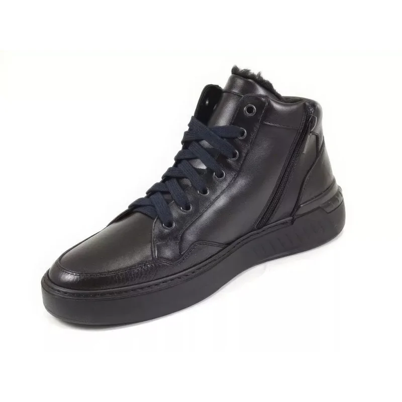 Nowoczesne trzewiki sportowe czarne w stylu casual, wykonane ze skóry naturalnej, ocieplone miękkim futerkiem. Model posiada suwak od wewnętrznej strony oraz lekką, elastyczną podeszwę, zapewniając komfort i wygodę w sezonie jesienno-zimowym.