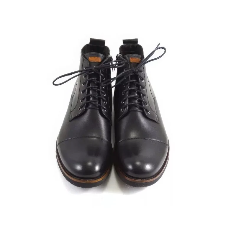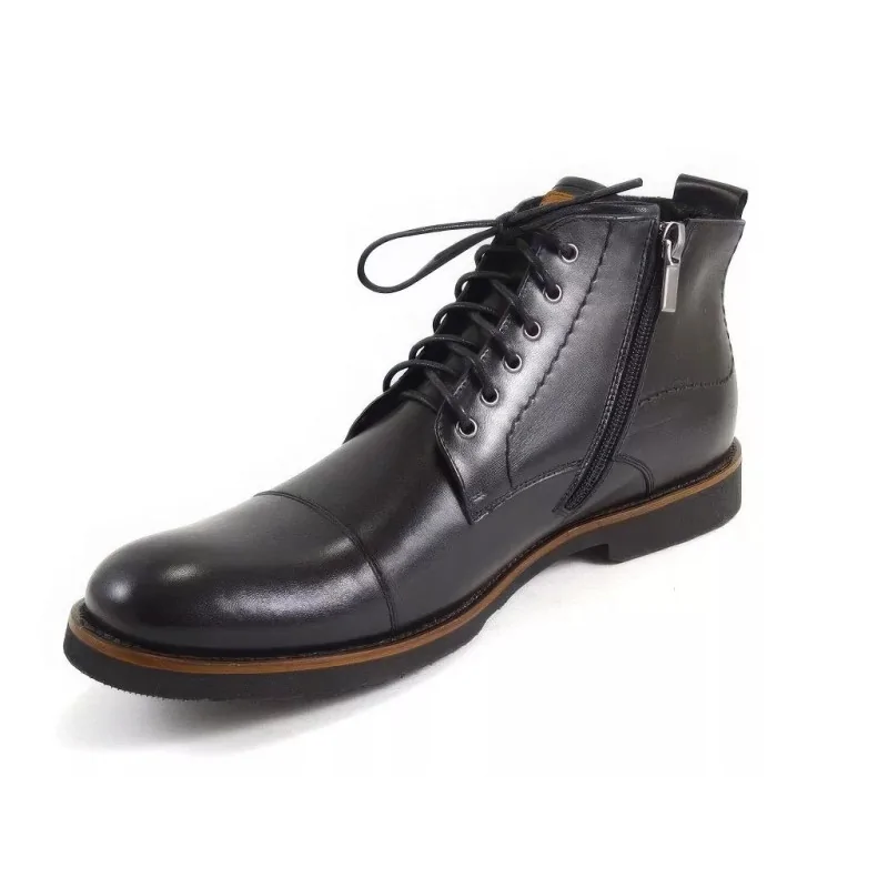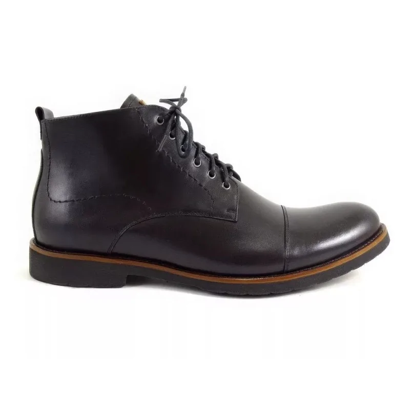 Klasyczne trzewiki zimowe czarne wykonane ze skóry naturalnej, z ociepliną i lekką piankową podeszwą zapewniającą komfort w chłodne dni. Model posiada sznurowanie oraz praktyczny zamek od wewnętrznej strony, co ułatwia zakładanie. Eleganckie męskie buty zimowe do stylizacji biznesowych, smart casual i codziennego użytkowania.