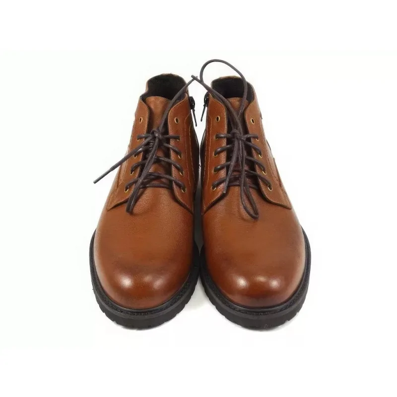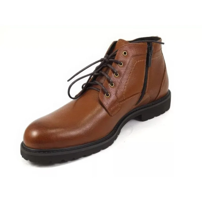 Casualowe trzewiki zimowe koniakowe w fasonie derby, wykonane ze skóry naturalnej o delikatnej fakturze, z ociepliną oraz suwakiem od wewnętrznej strony. Wygodne męskie buty zimowe z lekką podeszwą typu traktor, idealne na sezon jesienno-zimowy.