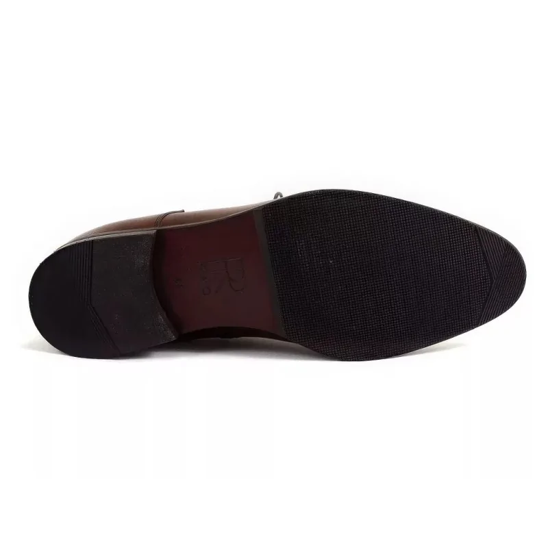 Fason derby z otwartą przyszwą zapewnia lepsze dopasowanie do stopy oraz wygodę użytkowania przez cały dzień. Gładki nosek bez perforacji nadaje modelowi minimalistycznego i eleganckiego charakteru. Orzechowy kolor skóry podkreśla szlachetny wygląd obuwia, dzięki czemu trzewiki zimowe orzechowe świetnie komponują się z płaszczem, garniturem, spodniami materiałowymi oraz stylizacjami smart casual.