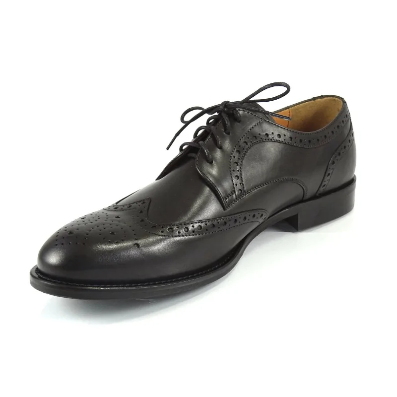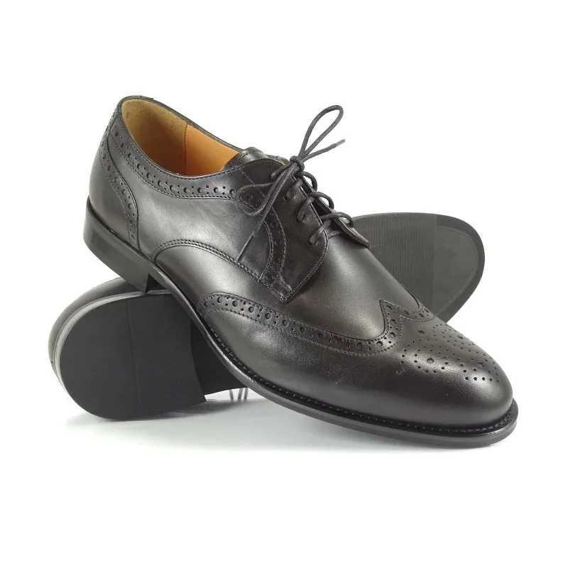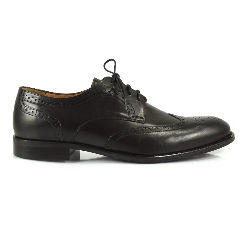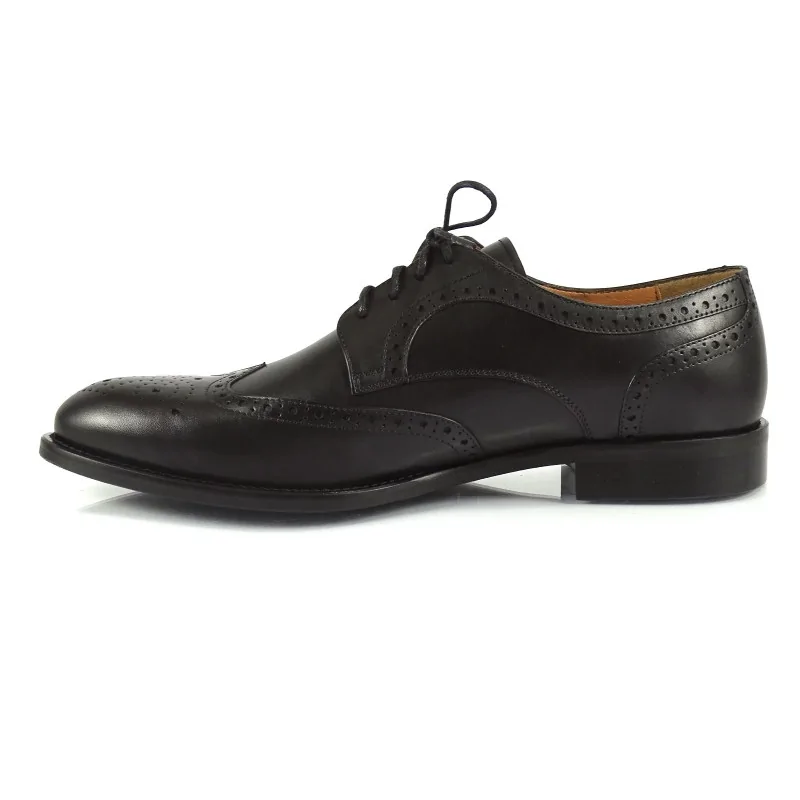 Model wyróżnia się zdobieniami typu brogsy, obejmującymi perforowane skrzydła (wingtip), ozdobne linie przeszyć oraz klasyczny medalion na czubku. Tego typu detale podkreślają prestiżowy charakter obuwia i nadają mu ponadczasowej elegancji. Czarne derby brogsy eleganckie doskonale sprawdzają się w stylizacjach formalnych, biznesowych oraz smart formal.