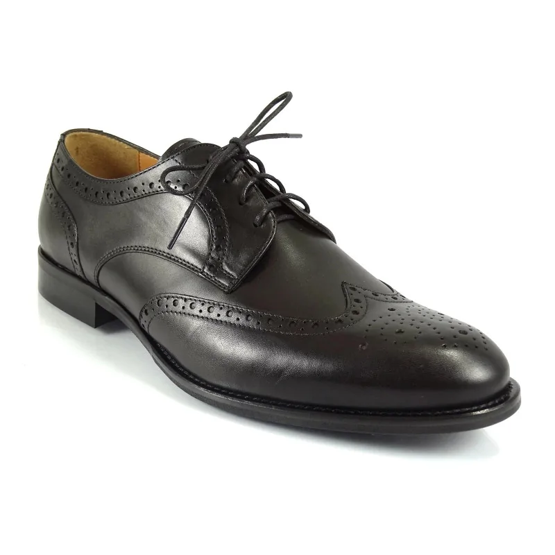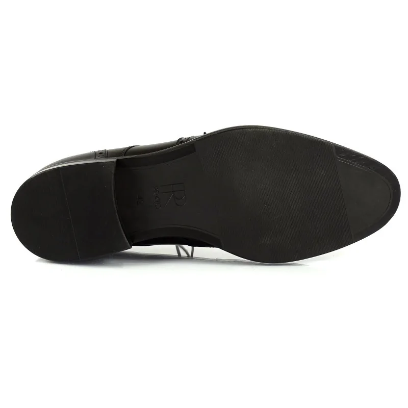 Czarne derby brogsy eleganckie Pilpol Prato PW217 to model premium z otwartą przyszwa, dekoracyjnymi perforacjami typu brogue oraz medalionem na nosku. Wykonane z wysokiej jakości skóry naturalnej, łączą klasyczną elegancję z ponadczasowym, formalnym charakterem.