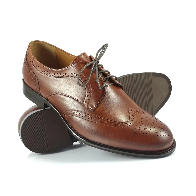Model wyróżnia się zdobieniami typu brogsy, obejmującymi perforowane skrzydła (wingtip), ozdobne linie perforacji oraz klasyczny medalion na czubku. Tego typu detale podkreślają prestiżowy charakter obuwia i nadają mu ponadczasowej elegancji. Koniak derby brogsy eleganckie doskonale sprawdzają się w stylizacjach formalnych, biznesowych oraz smart formal.