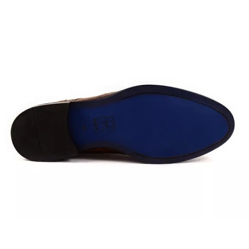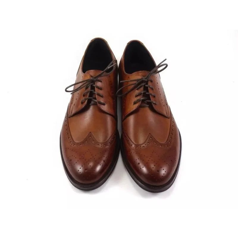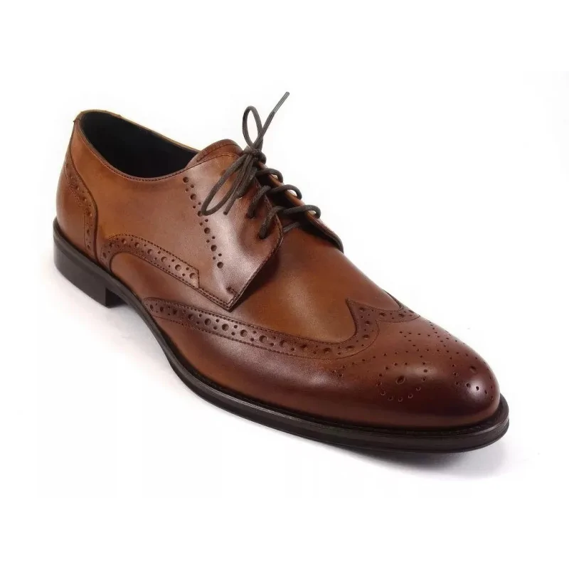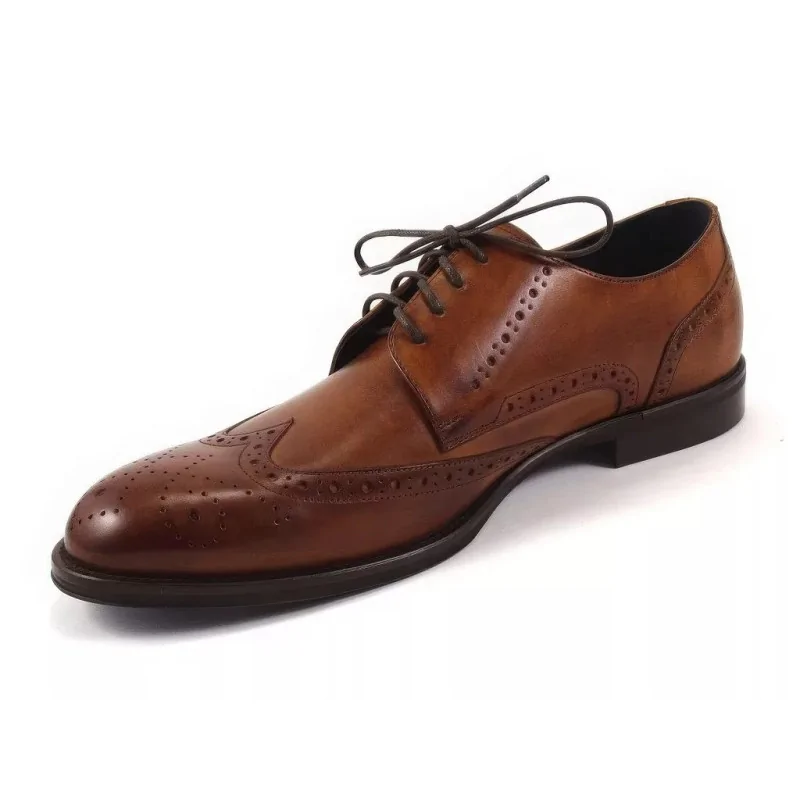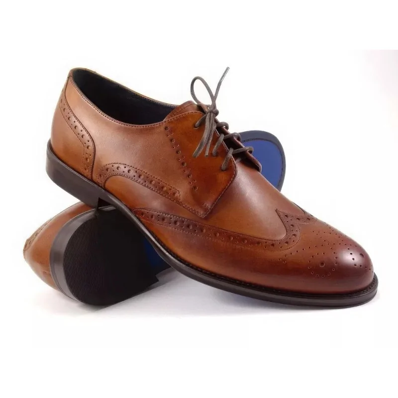 Konstrukcja typu derby z otwartą przyszwą zapewnia bardzo dobre dopasowanie do stopy oraz wysoki komfort użytkowania. Charakterystyczny skrzydlaty nosek (wingtip) oraz bogate perforacje brogue podkreślają klasyczny, elegancki styl obuwia. Dzięki temu brogsy koniakowe męskie doskonale sprawdzają się w stylizacjach biznesowych, wizytowych oraz smart casual.