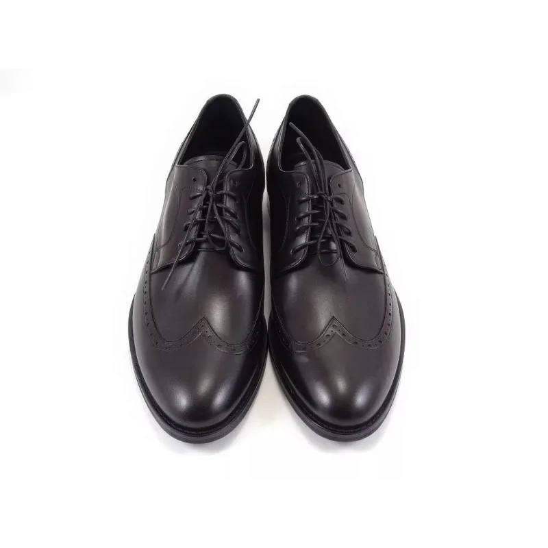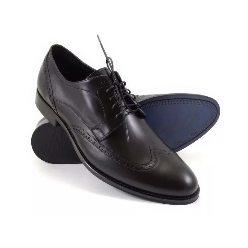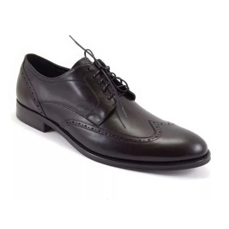 Otwarte sznurowanie z pięcioma parami eyeletów ułatwia dopasowanie i codzienne zakładanie. Czubek w stylu wingtip z medalionem i ozdobnymi perforacjami nadaje butom rozpoznawalny, klasyczny wygląd przy zachowaniu formalnego charakteru. Cholewka została wykonana z wysokogatunkowej skóry naturalnej w głębokiej czerni – gładka powierzchnia z delikatnym połyskiem, precyzyjne szwy i trwała konstrukcja sprawiają, że obuwie długo zachowuje nienaganny wygląd.