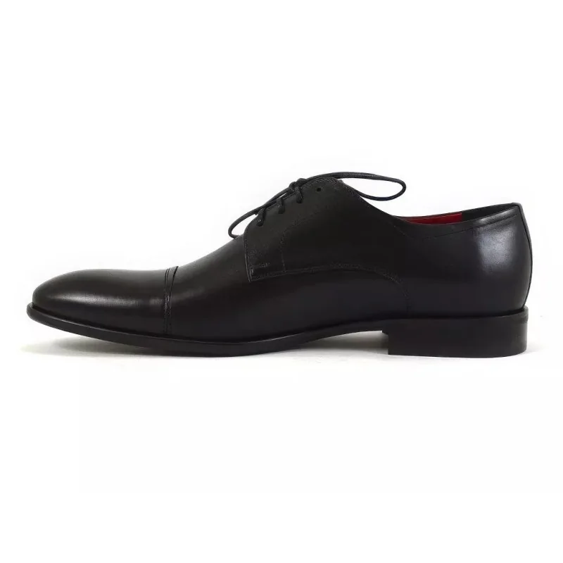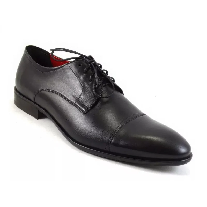 Derby męskie czarne Pilpol 1488 Premium to elegancki model typu cap toe osadzony na smukłym, wydłużonym kopycie. Cztery pary eyeletów zapewniają idealne dopasowanie, a wysokogatunkowa skóra cielęca gwarantuje trwałość i komfort. To eleganckie derby męskie stworzone do garnituru i formalnych stylizacji.