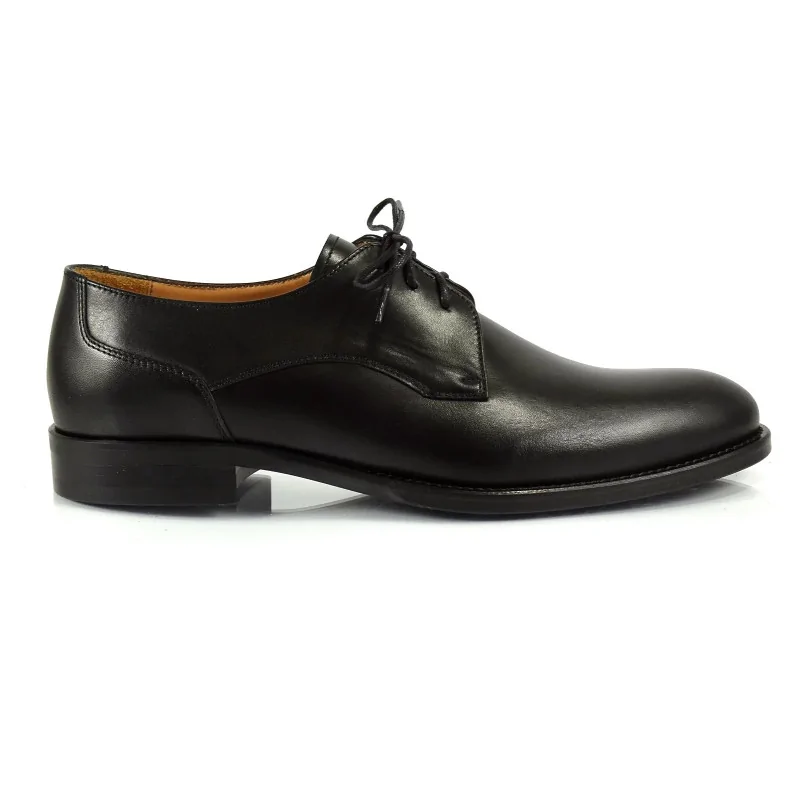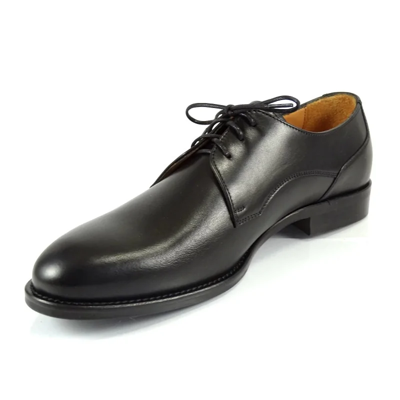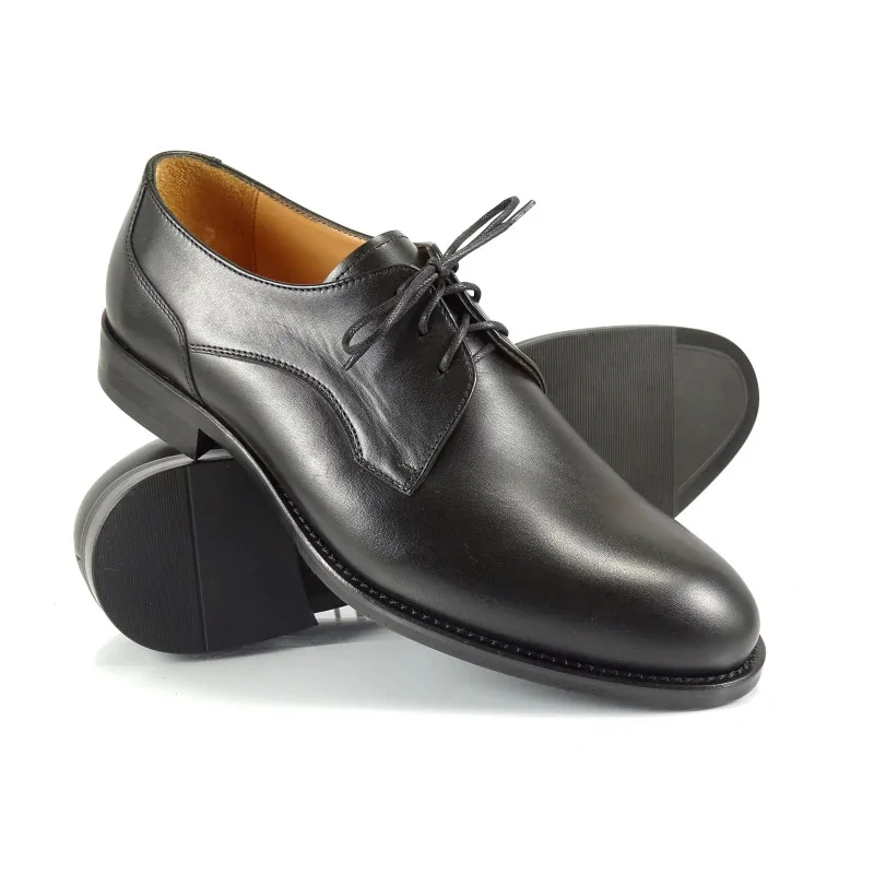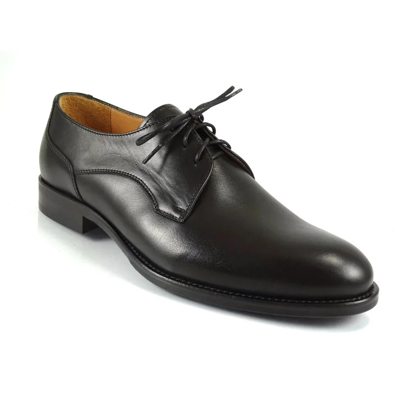 Czarne derby skórzane eleganckie Pilpol Prato PW219 to klasyczny model premium z otwartą przyszwa i gładkim noskiem plain toe. Wykonane z wysokiej jakości skóry naturalnej, zapewniają ponadczasowy styl oraz wysoki komfort użytkowania w formalnych i biznesowych stylizacjach.