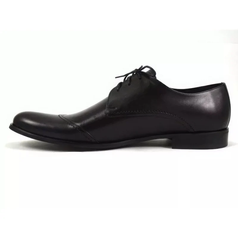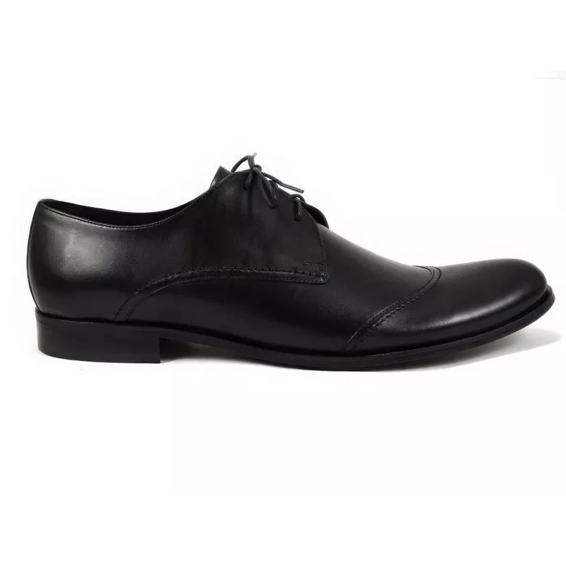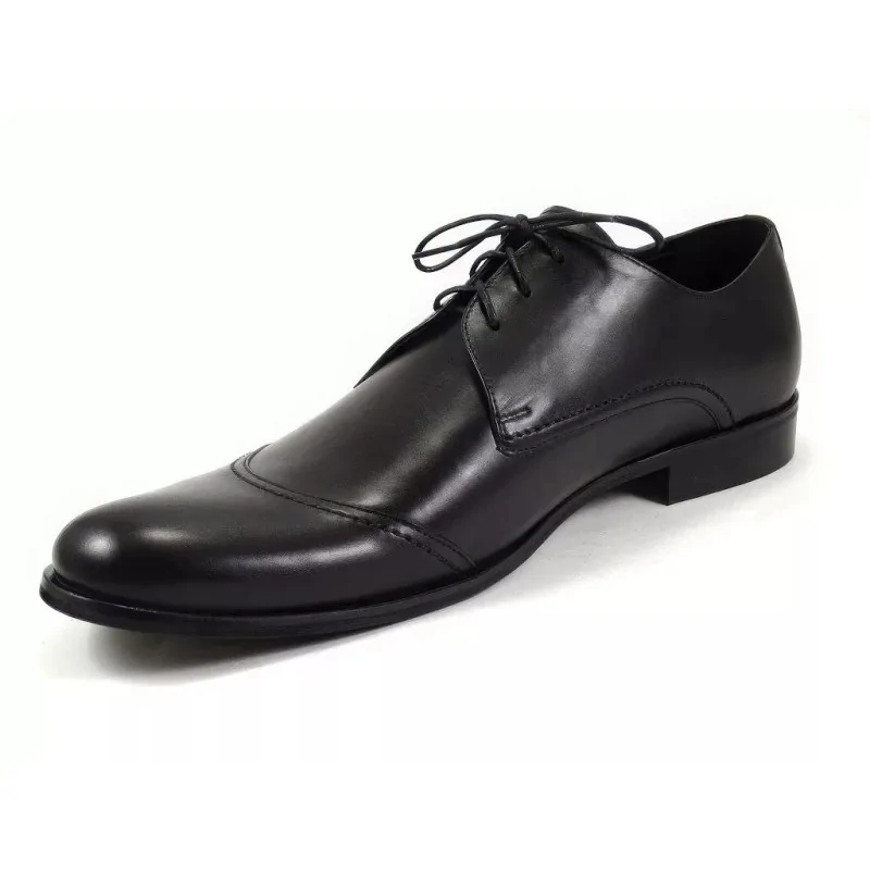 Derby czarne męskie Pilpol 790 to eleganckie buty wizytowe premium o zwiększonej tęgości, wykonane z wysokiej jakości skóry naturalnej. Klasyczna konstrukcja z otwartą przyszwą i subtelnym przeszyciem przy nosku zapewnia komfort, dopasowanie oraz ponadczasowy styl do garnituru i stylizacji biznesowych.