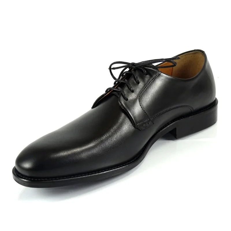 Model PW233 został zaprojektowany w konstrukcji derby z otwartą przyszwa oraz czterema parami eyeletów, co zapewnia lepsze dopasowanie do stopy i wygodę podczas wielogodzinnego użytkowania. Gładka cholewka bez perforacji podkreśla formalny charakter buta, czyniąc derby czarne Pilpol Prato doskonałym wyborem do garnituru oraz eleganckich stylizacji biurowych.