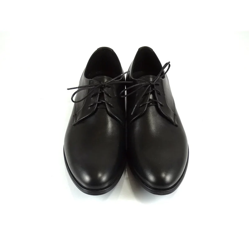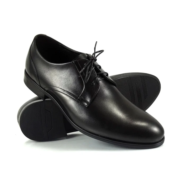 Model wykonany został z wysokogatunkowej skóry naturalnej licowej w głębokim, jednolitym odcieniu czerni. Gładki nosek (plain toe) bez perforacji i zdobień nadaje butom uniwersalny, formalny wygląd. Derby czarne skórzane eleganckie doskonale wpisują się w klasyczny dress code biznesowy oraz uroczystości wymagające nienagannej prezencji.