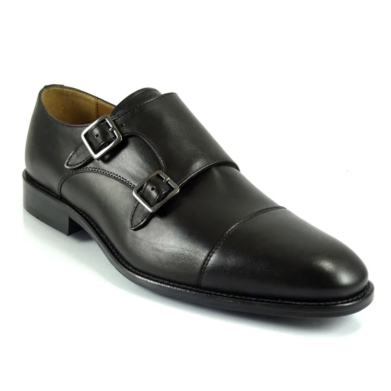 Double Monk Strap Czarne Pilpol Prato PW238 to eleganckie monki cap toe premium wykonane z wysokiej jakości skóry naturalnej. Klasyczna czerń, podwójna klamra oraz nakładany nosek tworzą ponadczasowe obuwie wizytowe idealne do garnituru, biznesu i stylizacji smart casual.