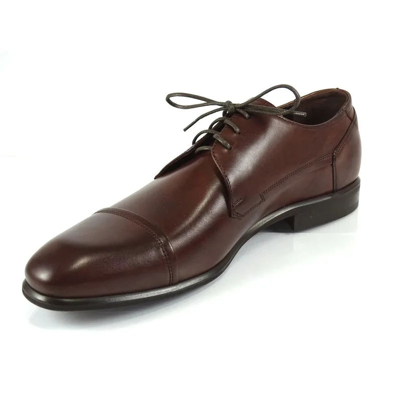 Konstrukcja typu derby z otwartą przyszwą zapewnia bardzo dobre dopasowanie do stopy oraz wygodę użytkowania przez cały dzień. Charakterystyczny nosek cap toe podkreśla klasyczny i wizytowy charakter obuwia, nadając mu elegancki, uporządkowany wygląd. Dzięki temu eleganckie derby orzechowe męskie idealnie sprawdzają się jako buty do garnituru, biura oraz na oficjalne wydarzenia.