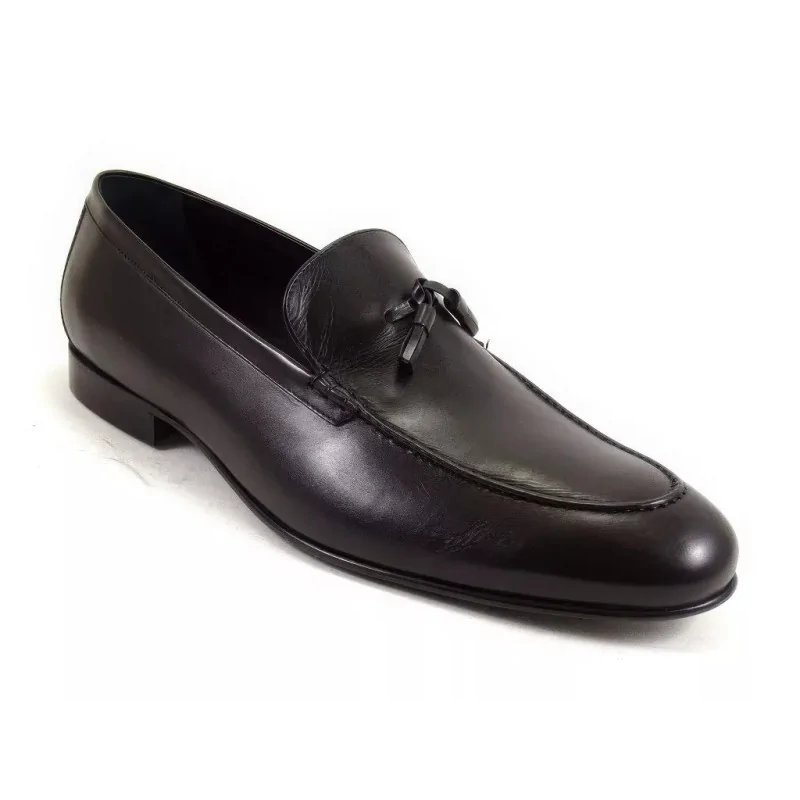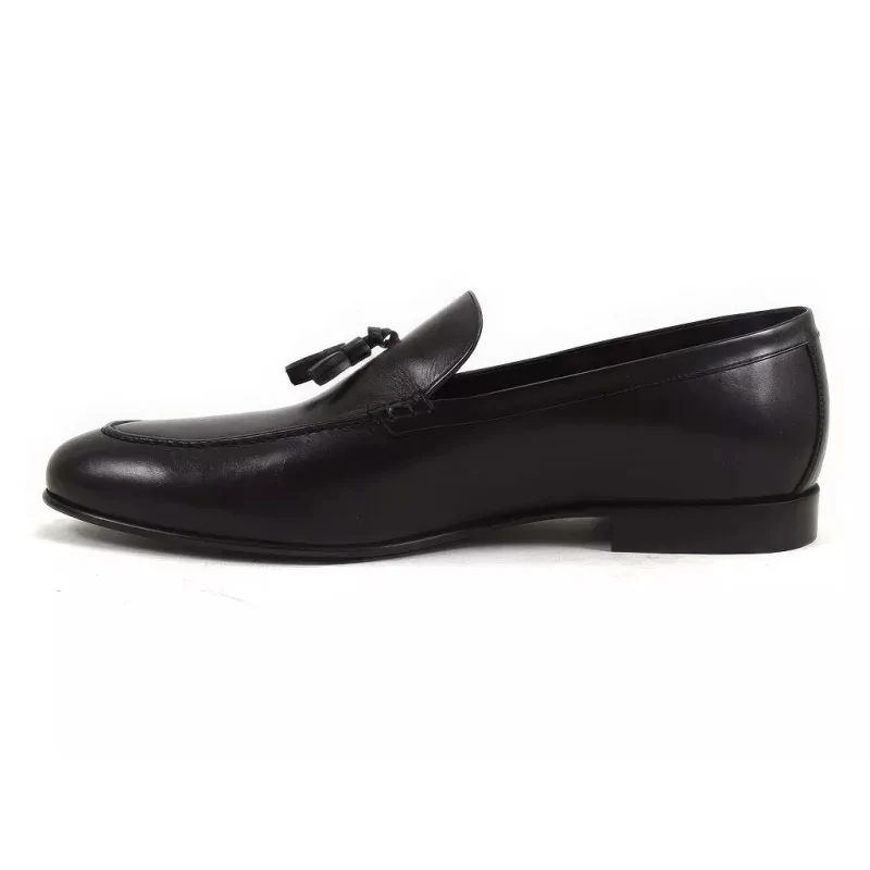 Eleganckie loafersy czarne męskie Pilpol Prato PW056 to luksusowe buty wsuwane premium wykonane z wysokiej jakości skóry naturalnej. Minimalistyczna forma, mokasynowe szycie oraz dekoracyjne chwosty zapewniają ponadczasowy styl i wysoki komfort użytkowania.