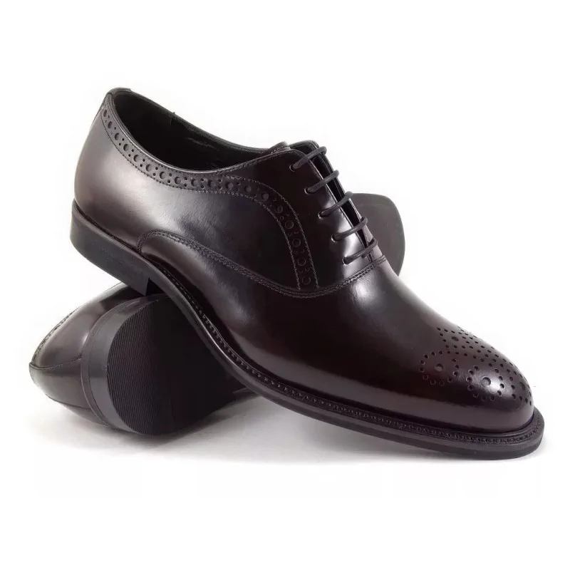 Oxford burgund męskie Pilpol Prato PW161 to eleganckie buty premium z zamkniętą przyszwą, efektownym medalionem i subtelnymi perforacjami. Wykonane z połyskującej skóry naturalnej w odcieniu ciemnego burgundu, idealnie sprawdzą się w stylizacjach wizytowych, ślubnych oraz biznesowych.