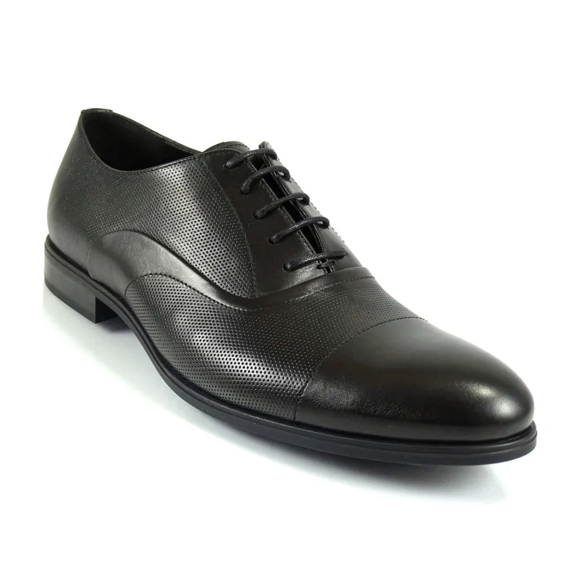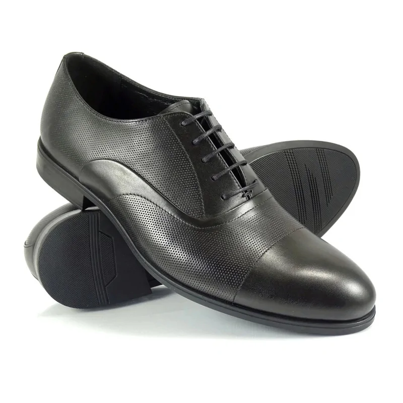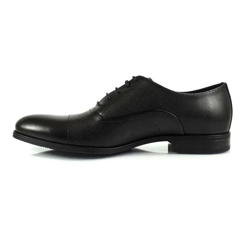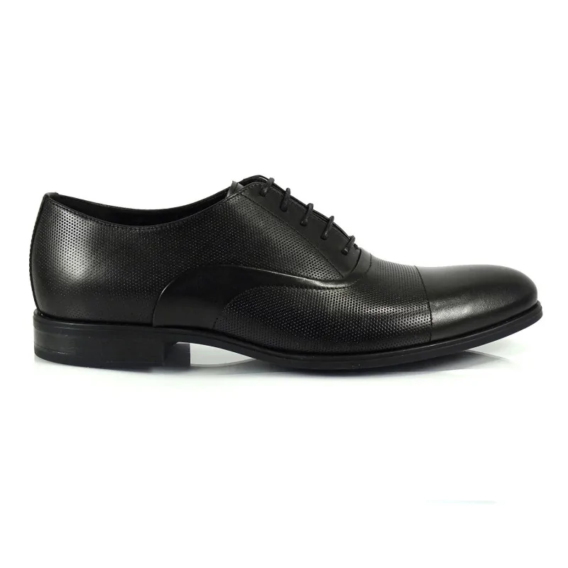 Oxford czarne skórzane eleganckie Pilpol Prato PW224 to model premium z zamkniętą przyszwa oraz subtelną perforowaną matrycą na cholewce. Klasyczny nosek cap toe i wysokiej jakości skóra naturalna podkreślają formalny, biznesowy charakter obuwia.