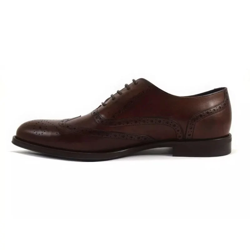 Oxford brogowany orzech Pilpol Prato PW141 Premium to eleganckie, w pełni brogowane oxfordy wykonane z wysokiej jakości skóry licowej w szlachetnym odcieniu orzecha. Zamknięta przyszwa, smukłe kopyto oraz klasyczne zdobienia brogue podkreślają formalny i luksusowy charakter modelu.