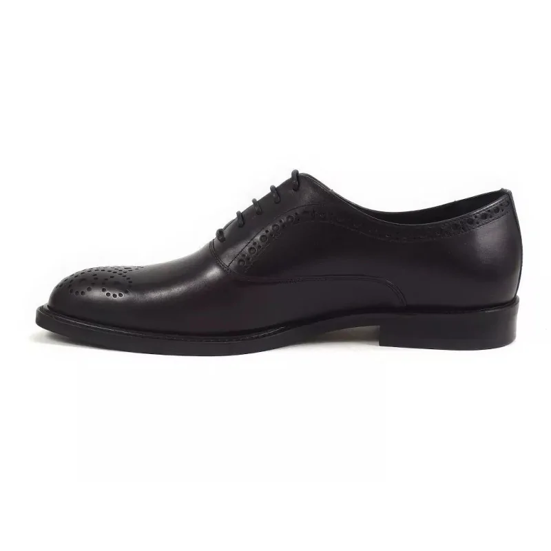 Konstrukcja typu oxford z zamkniętą przyszwą to najbardziej formalna forma obuwia męskiego, ceniona za elegancję i minimalistyczny charakter. Ozdobny medalion na nosku nadaje butom subtelnego, dekoracyjnego akcentu, zachowując jednocześnie klasyczny styl. Dzięki temu oxfordy czarne męskie doskonale sprawdzają się jako buty do garnituru, na uroczystości oraz oficjalne spotkania biznesowe.