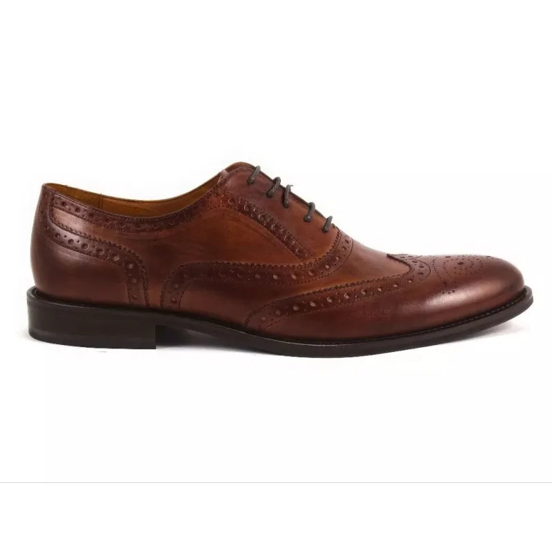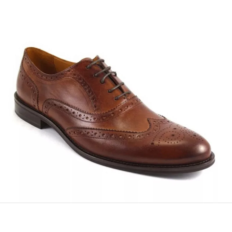Charakterystyczne perforacje typu wingtip nadają butom szlachetnego, brytyjskiego charakteru. Odcień koniakowy podkreśla głębię skóry i nadaje stylizacji wyrafinowanego, ale nieprzesadzonego tonu. Oxfordy męskie koniak świetnie komponują się z garniturami granatowymi, grafitowymi oraz brązowymi, a także z elegancką marynarką i spodniami chino.