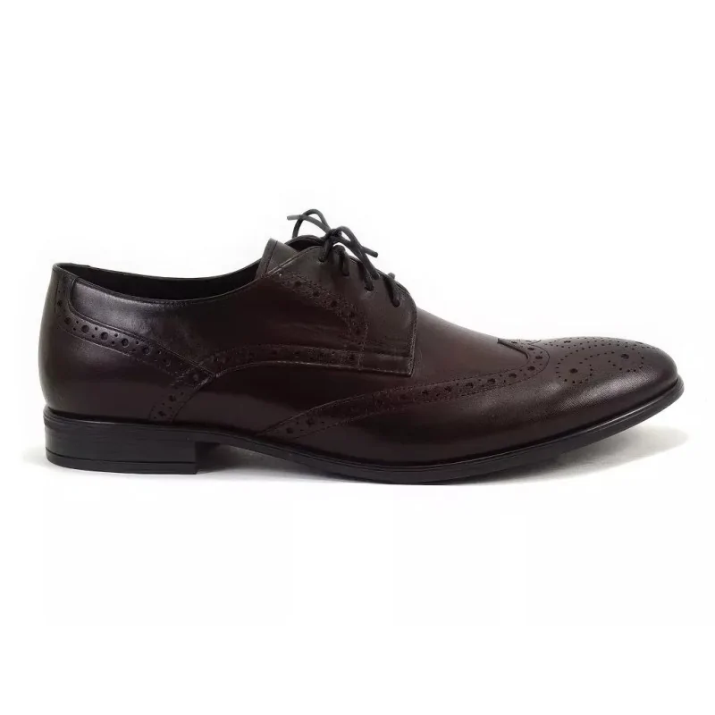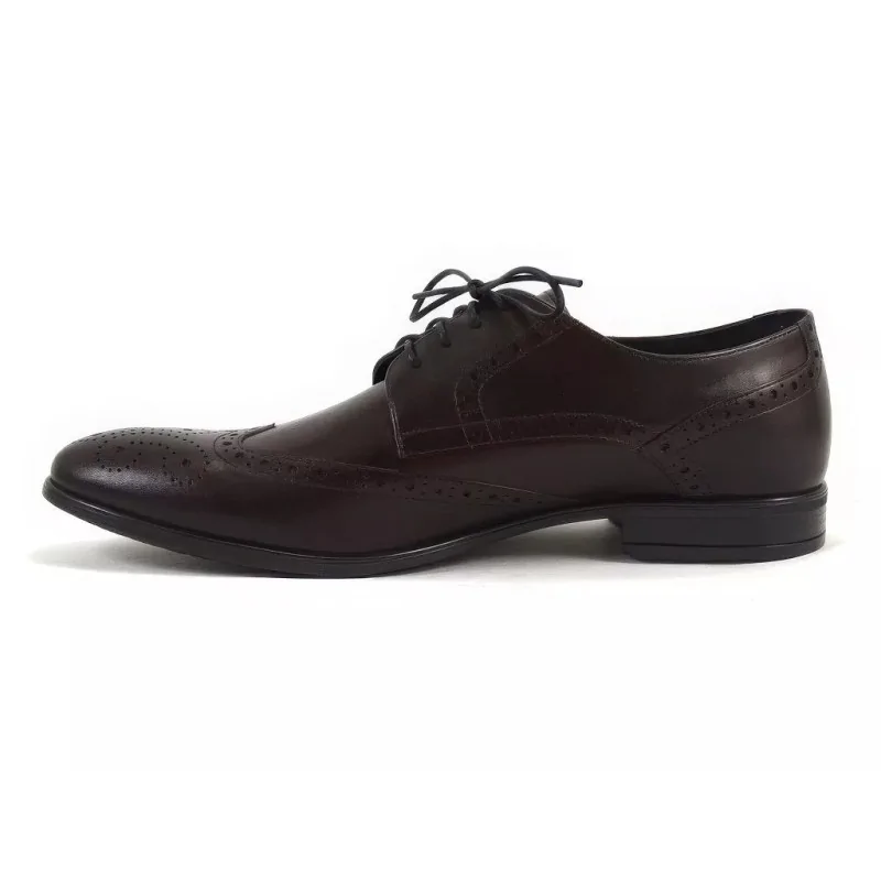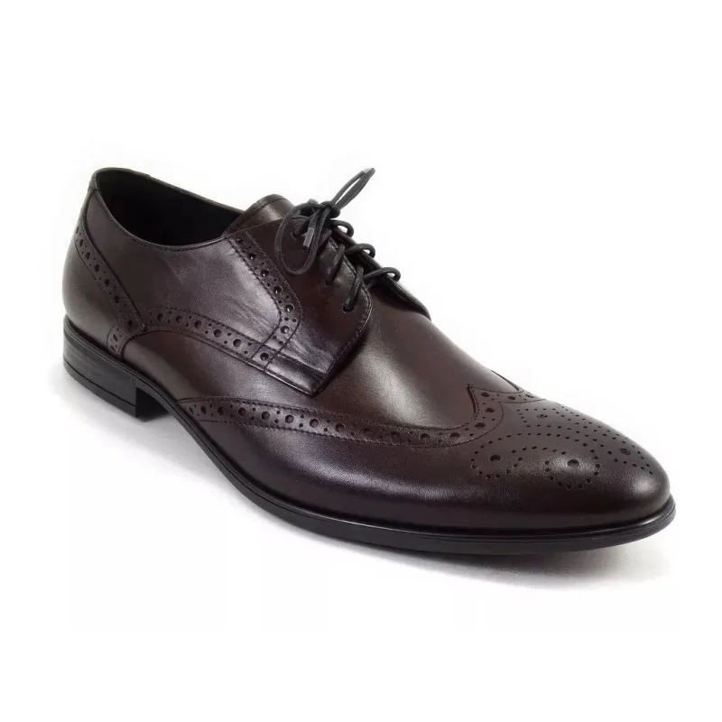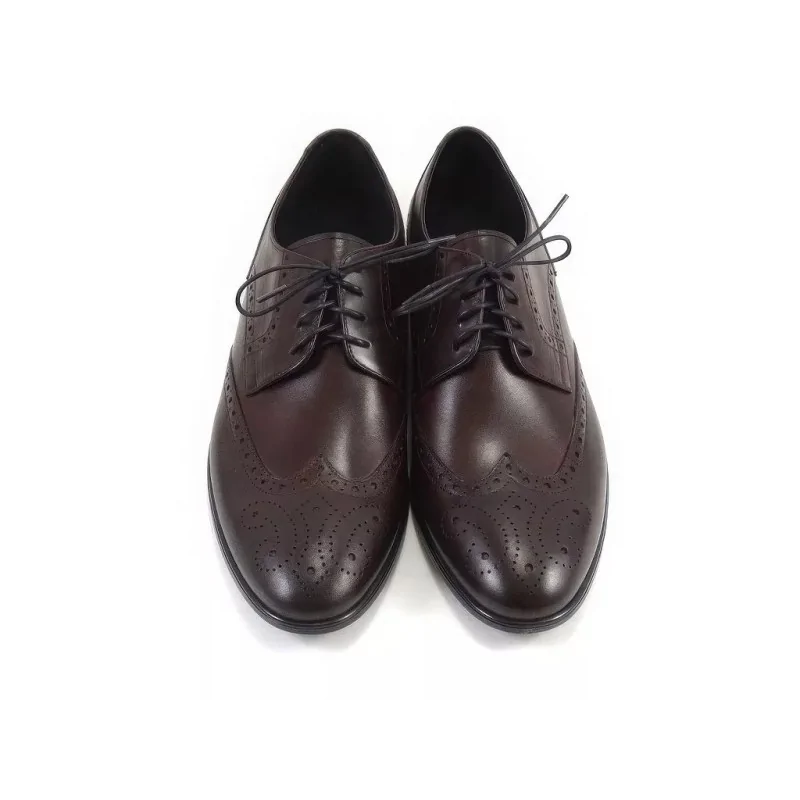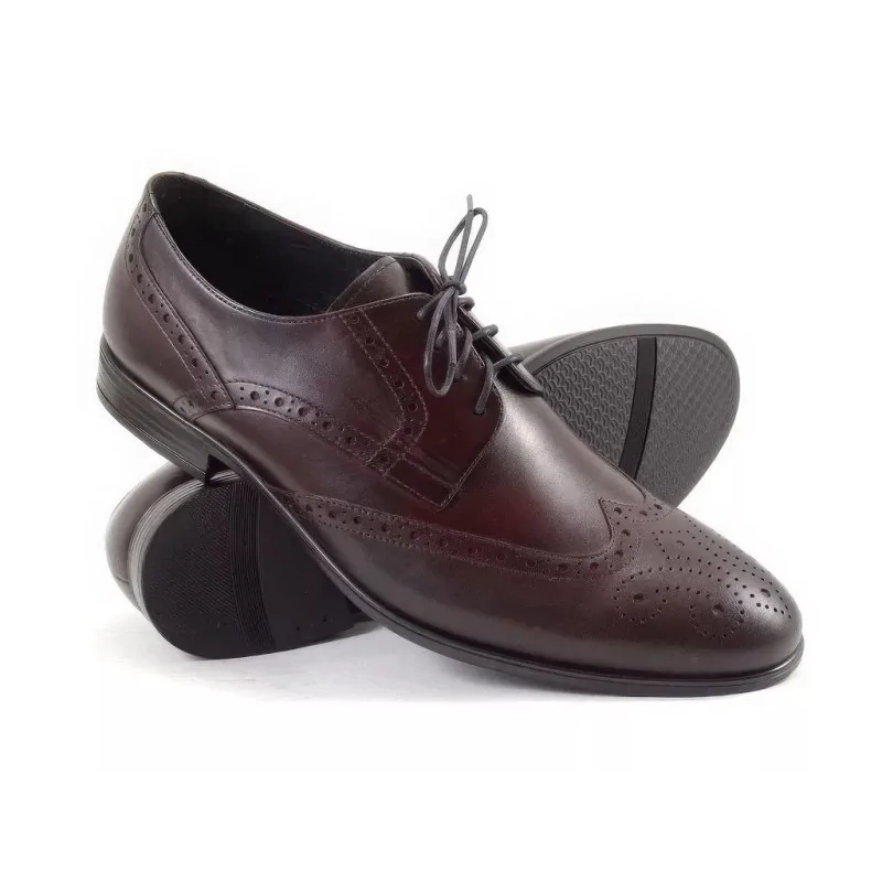 Konstrukcja typu derby z otwartą przyszwą gwarantuje wygodne dopasowanie do stopy oraz wysoki komfort noszenia przez wiele godzin. Skrzydlaty nosek (wingtip) oraz bogate perforacje podkreślają elegancki, ale jednocześnie stylowy charakter modelu. Dzięki temu brogsy burgundowe męskie świetnie sprawdzają się jako obuwie męskie do biura, na spotkania biznesowe oraz półformalne okazje.