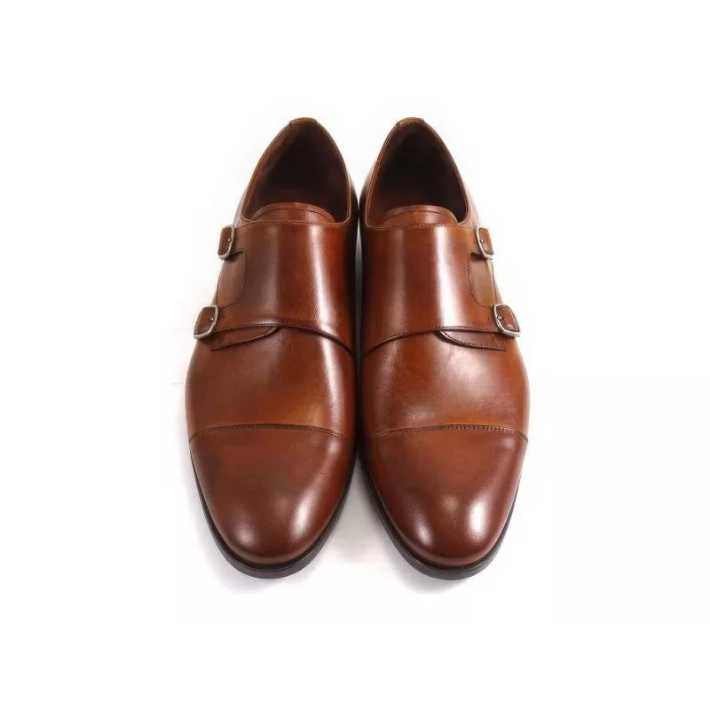 Monki męskie koniakowe 1717 to model w ponadczasowym fasonie double monk, wyróżniający się dwiema metalowymi klamrami oraz eleganckim nakładanym noskiem (cap toe). Konstrukcja bez sznurowadeł nadaje butom nowoczesnego, a jednocześnie bardzo stylowego charakteru.