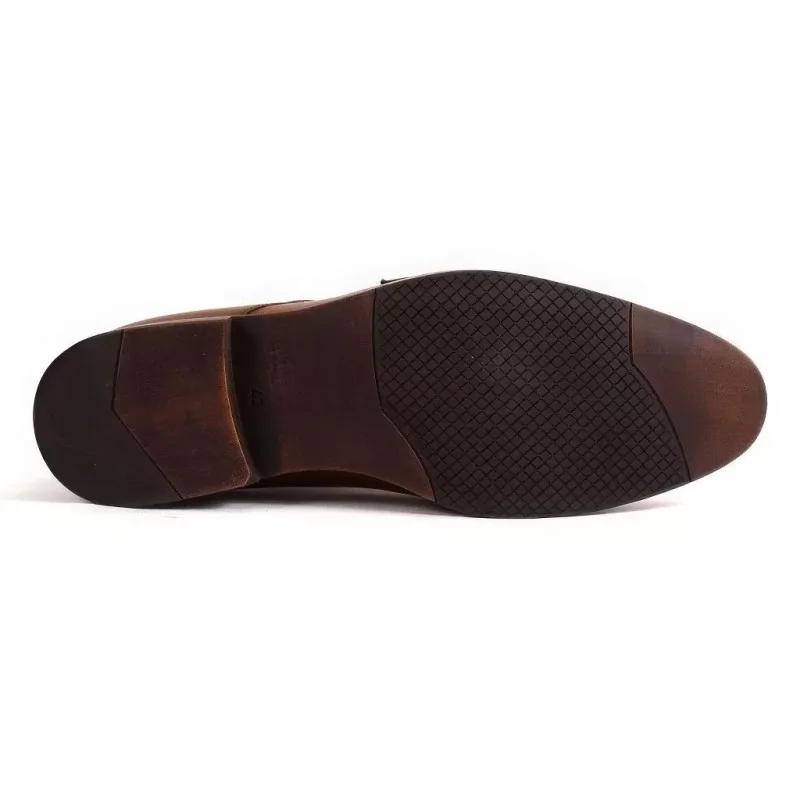 Model 1717 wykonano z naturalnej skóry licowej o subtelnym połysku. Materiał dobrze dopasowuje się do stopy i zapewnia komfort użytkowania. Solidna podeszwa z delikatnym bieżnikiem zwiększa stabilność oraz przyczepność, dzięki czemu buty monki męskie koniak sprawdzą się zarówno w biurze, jak i podczas formalnych uroczystości.