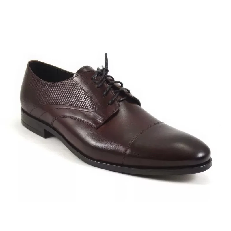 Model został wzbogacony o elegancki nosek typu cap toe oraz subtelną, matrycową fakturę skóry na bocznych panelach cholewki. Derby burgundowe pilpol zachowują formalny charakter, jednocześnie wyróżniając się nowoczesnym detalem stylistycznym, który podkreśla ich unikalny design.