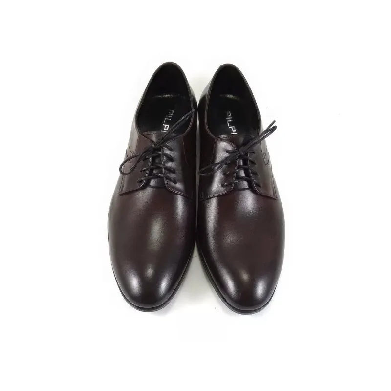 Burgundowe derby męskie Pilpol 1735 to klasyczne buty wizytowe w segmencie regular. Model wykonany z gładkiej skóry naturalnej w głębokim odcieniu burgundu. Otwarta przyszwa oraz 4 pary eyeletów zapewniają wygodne dopasowanie i uniwersalny charakter.
