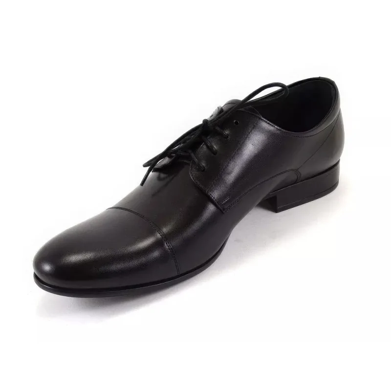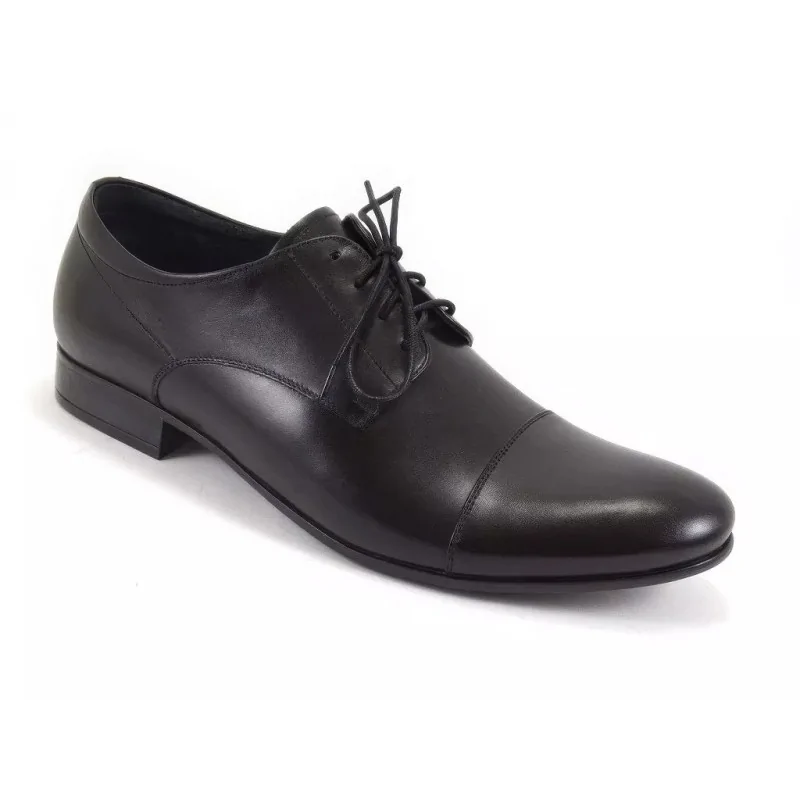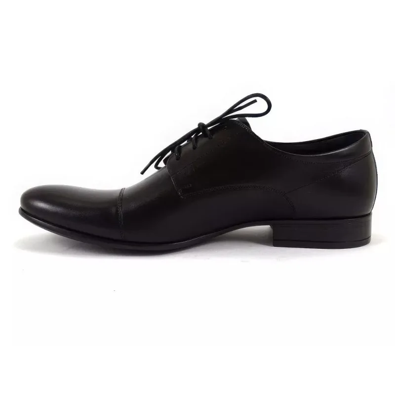 Czarne derby skórzane eleganckie Pilpol 1653 to klasyczne obuwie wizytowe w segmencie regular z charakterystycznym noskiem typu cap toe. Model posiada otwartą przyszwa, gładką cholewkę z wysokiej jakości skóry naturalnej oraz elegancką, smukłą linię idealną do stylizacji formalnych i biznesowych.