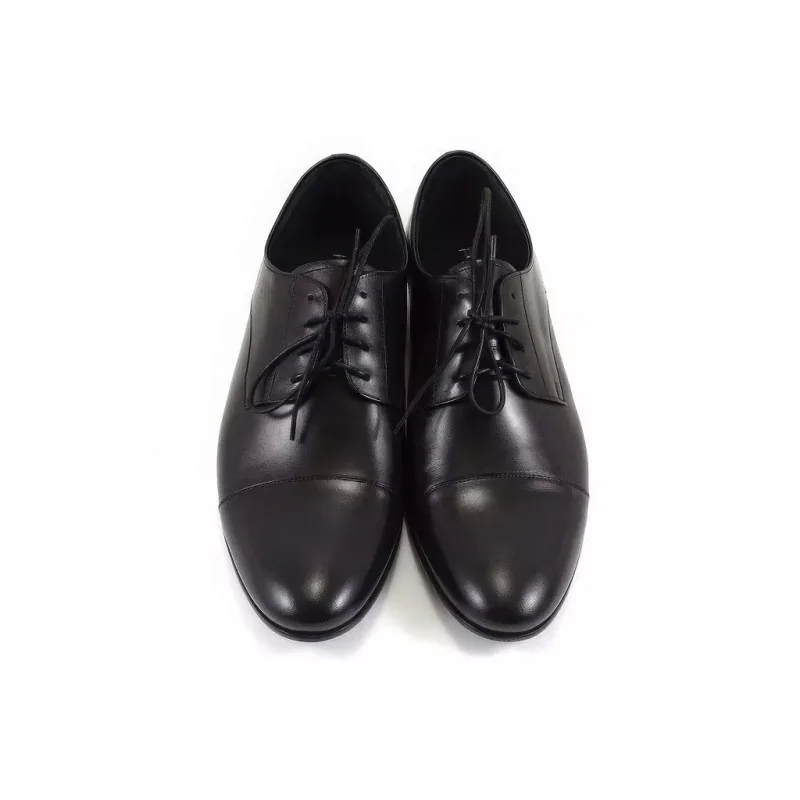 Model wyróżnia się prostą, elegancką linią oraz charakterystycznym przeszyciem na przodzie cholewki (cap toe), które dodaje subtelnej struktury bez nadmiernych zdobień. Gładka skóra licowa o delikatnym połysku podkreśla formalny charakter obuwia, dzięki czemu czarne derby skórzane eleganckie świetnie komponują się z garniturem, marynarką oraz eleganckimi spodniami.