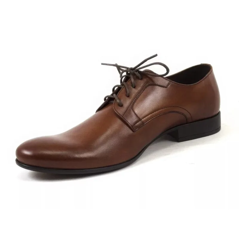 Koniak derby skórzane eleganckie Pilpol 1672 to klasyczne buty wizytowe typu plain toe w segmencie regular. Model posiada otwartą przyszwa, gładki nosek bez perforacji oraz smukłą linię, która doskonale komponuje się z garniturem i stylizacjami biznesowymi.