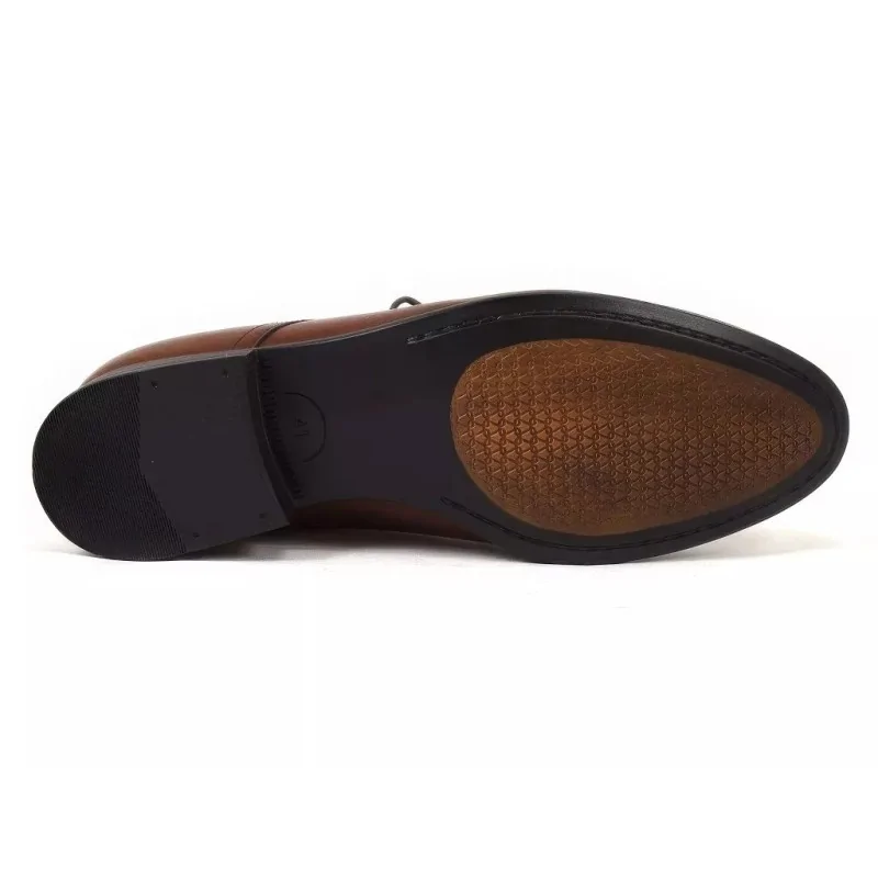 Model 1672 to buty typu plain toe, czyli z gładkim noskiem pozbawionym perforacji i zdobień. Taka konstrukcja podkreśla formalny charakter obuwia, czyniąc je idealnym wyborem do garnituru, marynarki oraz eleganckich spodni materiałowych. Koniak derby skórzane eleganckie świetnie przełamują klasyczne, ciemne stylizacje, dodając im nowoczesnej lekkości.