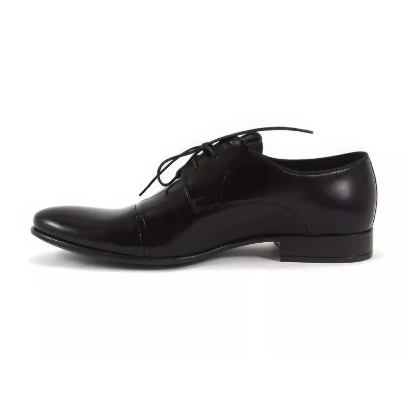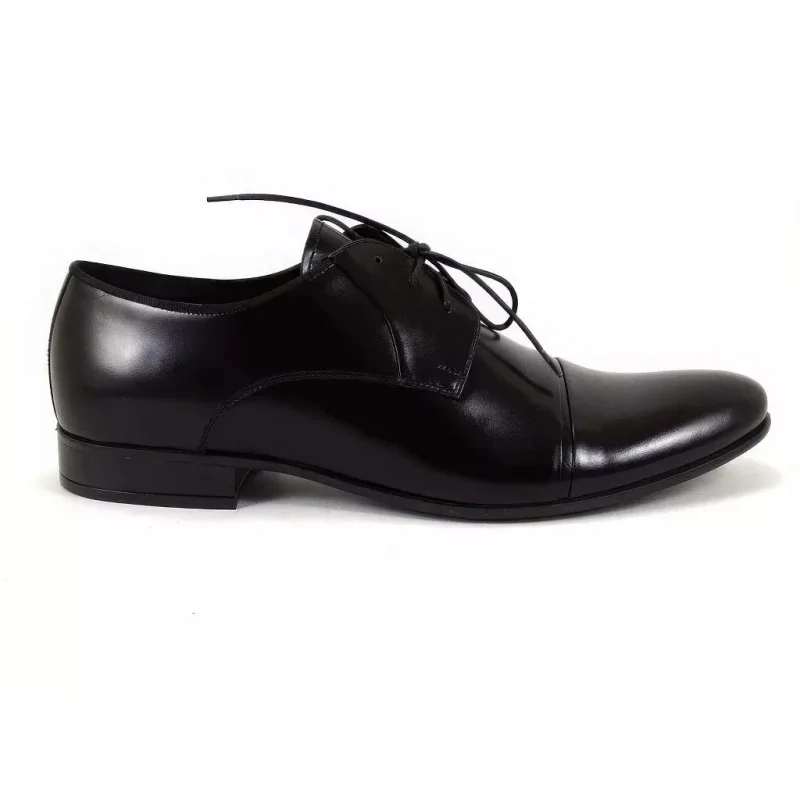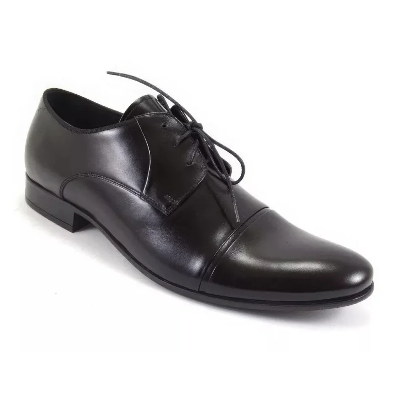 Derby męskie czarne Pilpol 1604 to klasyczny model z nakładką cap toe, wykonany ze skóry naturalnej o subtelnym, eleganckim połysku. To nie jest lakier – połysk wynika z wykończenia skóry, które nadaje butom bardziej formalny charakter.