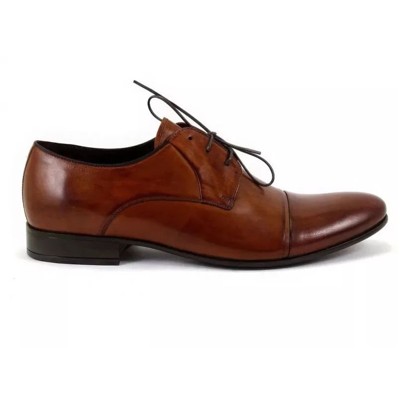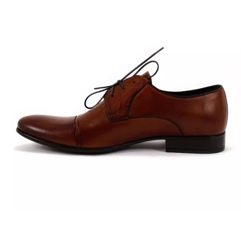 Derby męskie koniak Pilpol 1604 to elegancki model z nakładką cap toe. Otwarta przyszwa zapewnia wygodne dopasowanie, a naturalna skóra i trwała podeszwa czynią ten model idealnym wyborem do pracy i na formalne okazje.